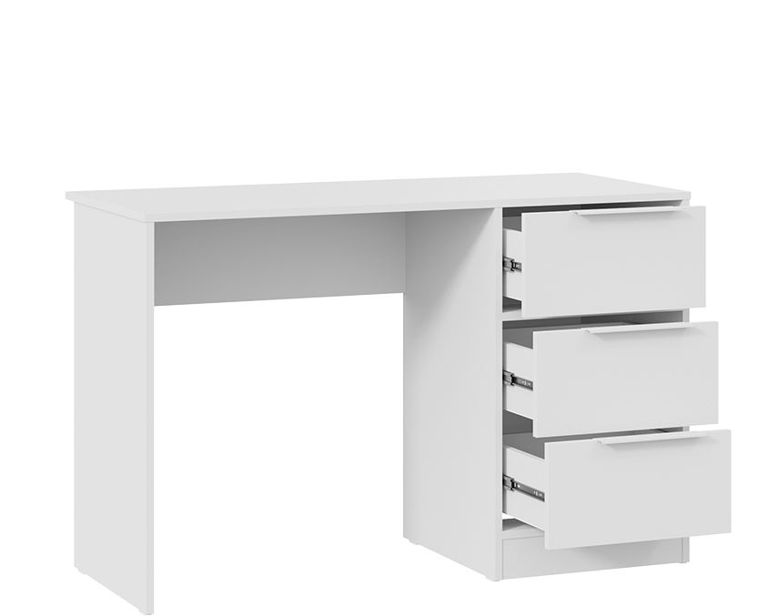 Стильный и минималистичный внешний вид стола создается благодаря белому фасаду и корпусу. Конструкция включает в себя три вместительных ящика для письменных принадлежностей, книг и учебников.