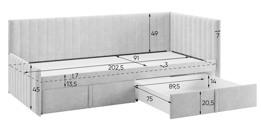 - Вместительные ящики: под спальным местом находятся выкатные ящики для хранения постельного белья, одежды или игрушек.