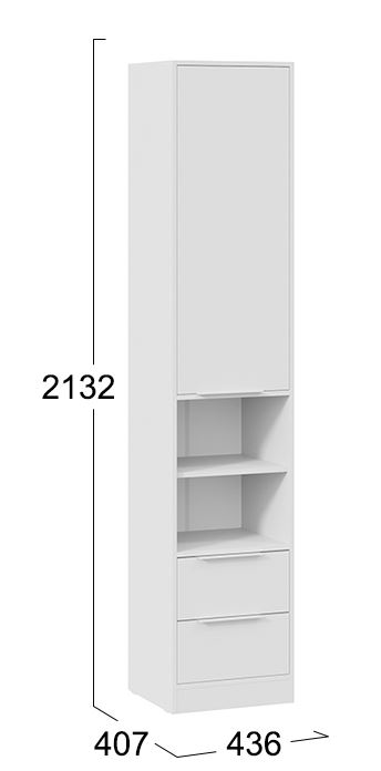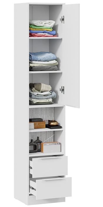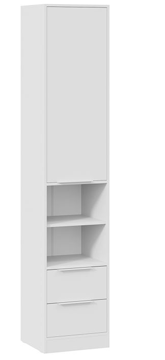 Конструкция комбинированного шкафа "Марли" включает в себя открытые полки и закрытые полки, и два выдвижных ящика на шариковых направляющих.