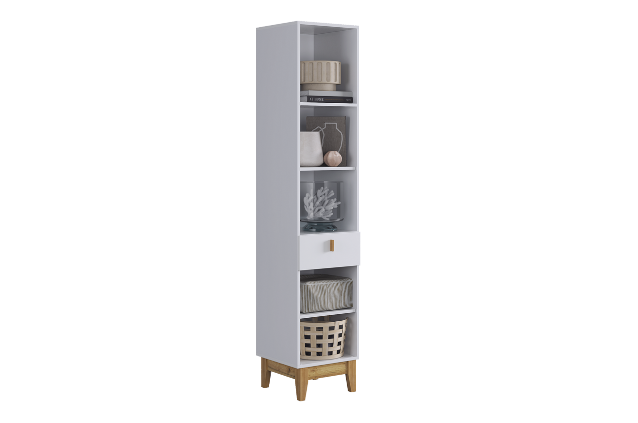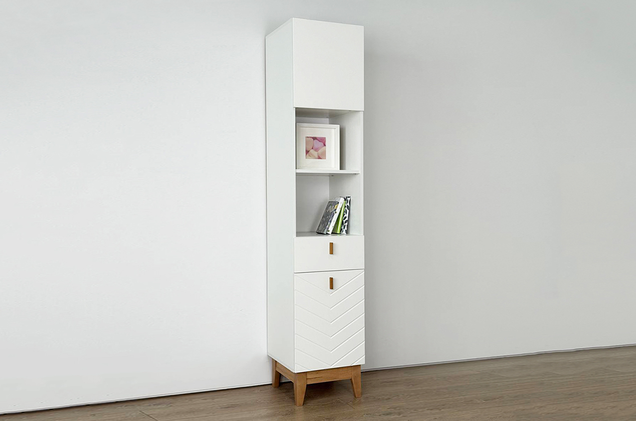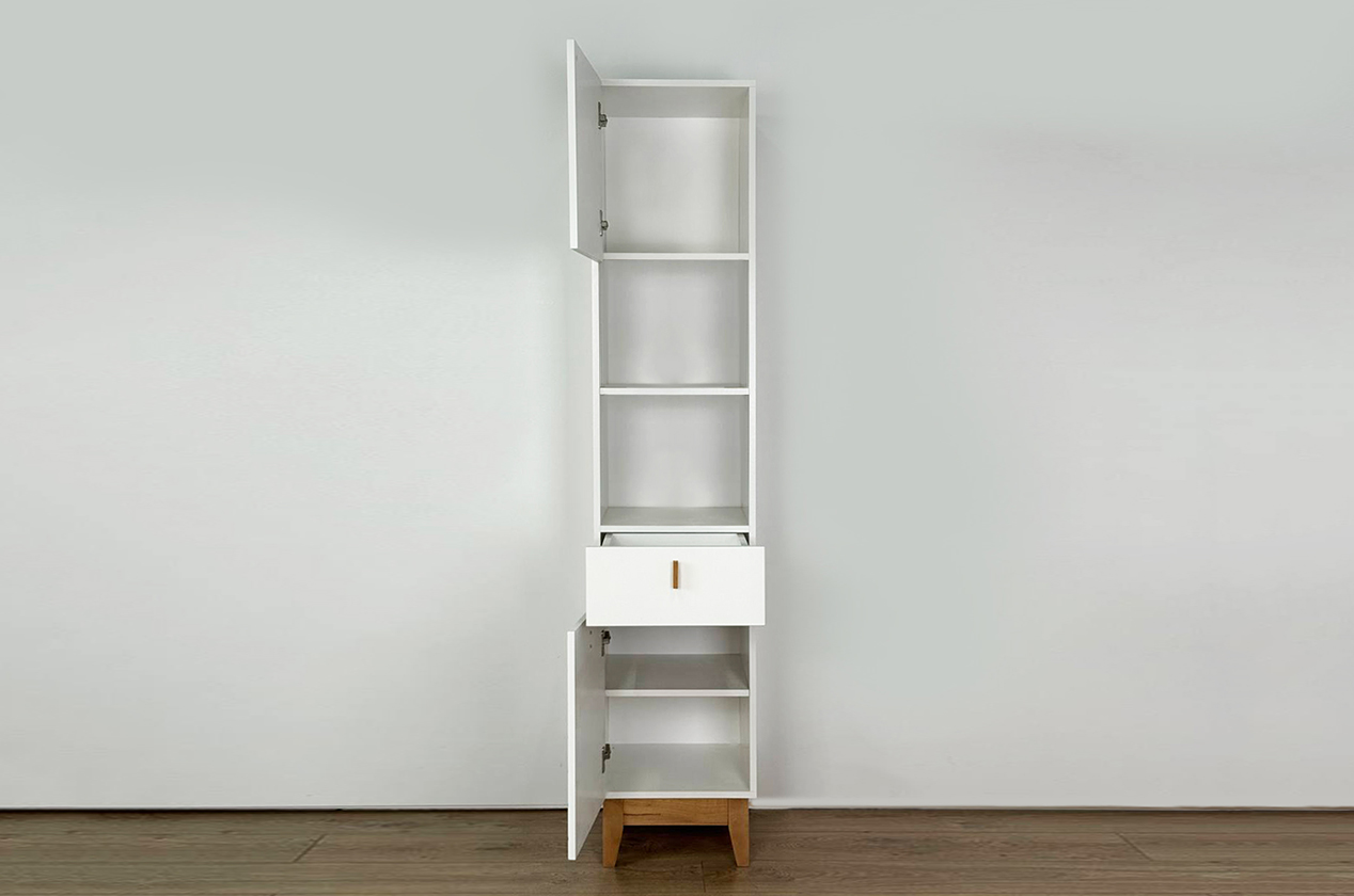 Узкий многофункциональный стеллаж для организации хранения в любом помещении. Модель сочетает закрытые и открытые секции, что позволяет гибко зонировать пространство и поддерживать порядок. Выполнен в лаконичном скандинавском стиле.