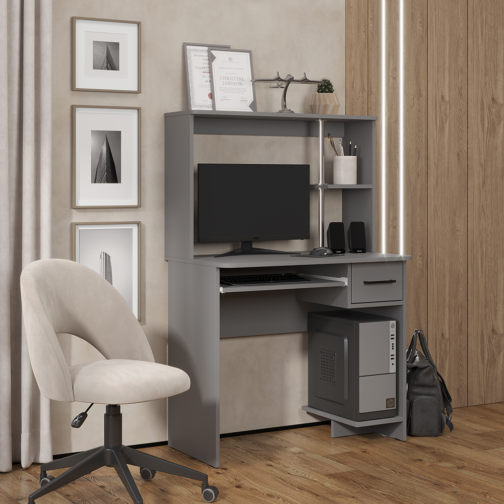 • Организация пространства: Надстройка над столом позволяет разместить аудиосистему, фотографии или декор, освобождая основную зону для работы. Выдвижная панель для клавиатуры обеспечивает эргономичное положение рук.