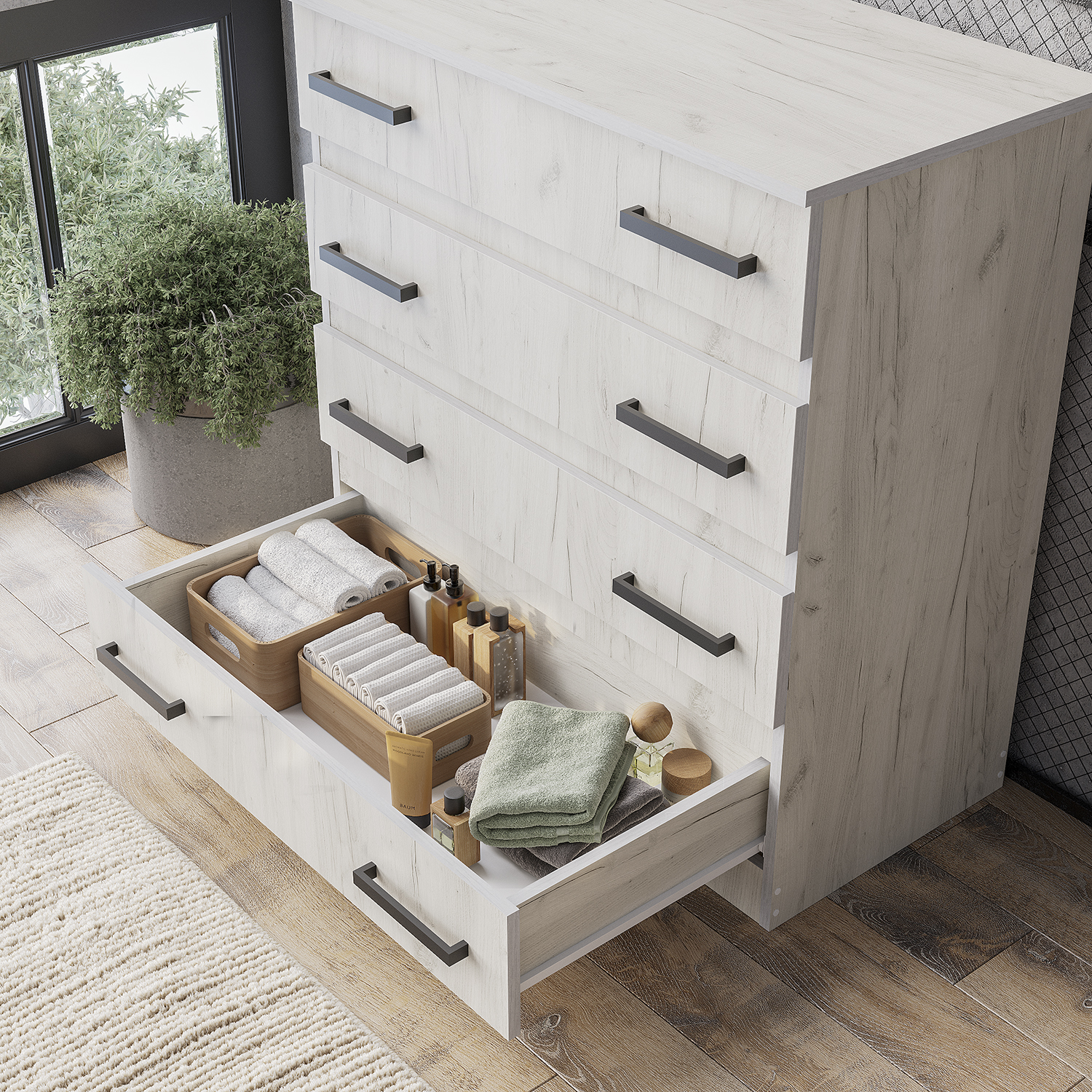 · 6 просторных выдвижных ящиков на роликовых направляющих (длина 400 мм). Оптимально для хранения постельного белья, полотенец, одежды и документов. Нагрузка на ящик — до 5 кг.