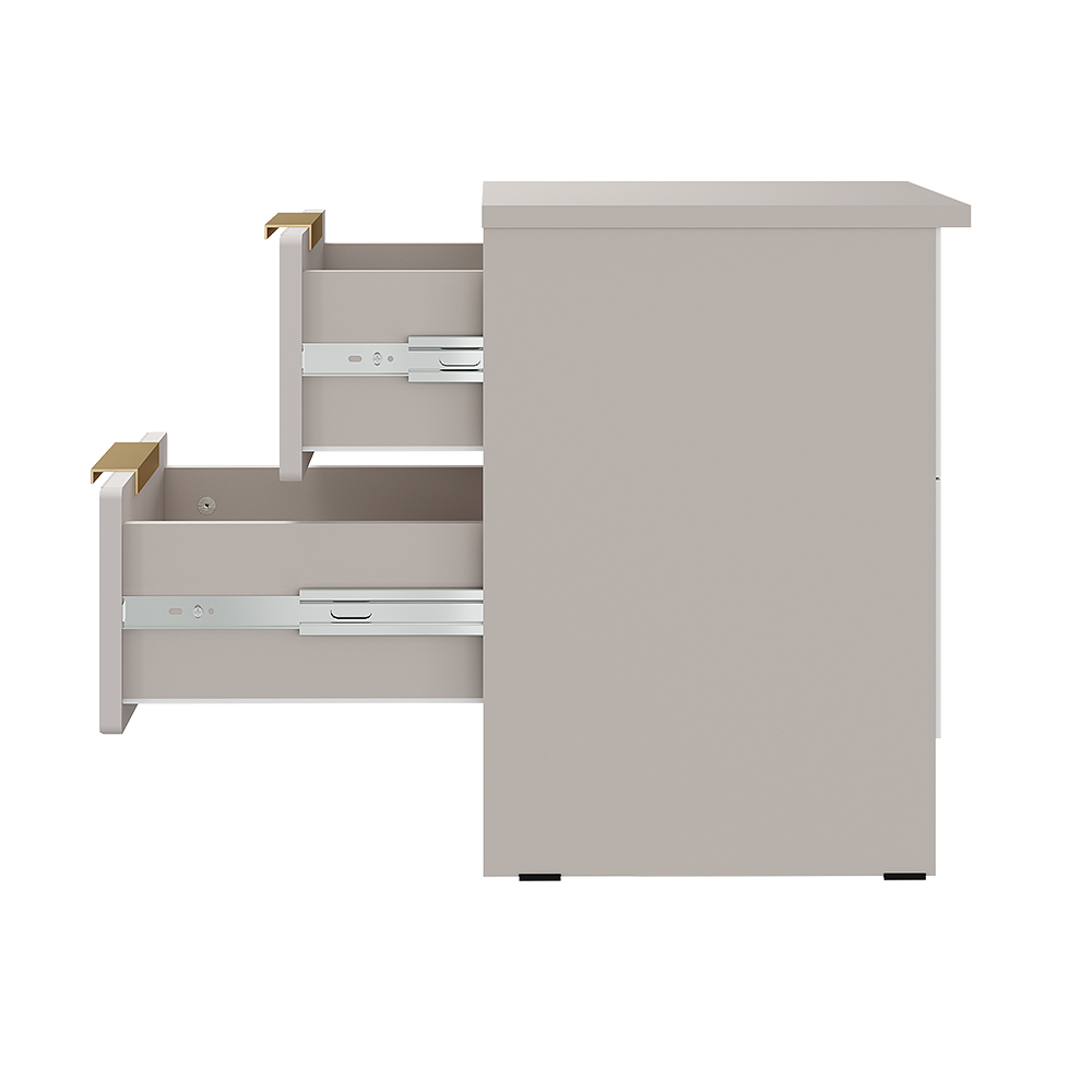 Нежные оттенки фасада «айриш» и корпуса «кашемир» создают атмосферу уюта, а элегантная фрезеровка на фасаде добавляет модели изысканности и подчеркивает текстуру МДФ. Стильные ручки из АБС-пластика (128 мм) в цвете «пыльно-матовое золото» завершают эстетичный образ тумбы.