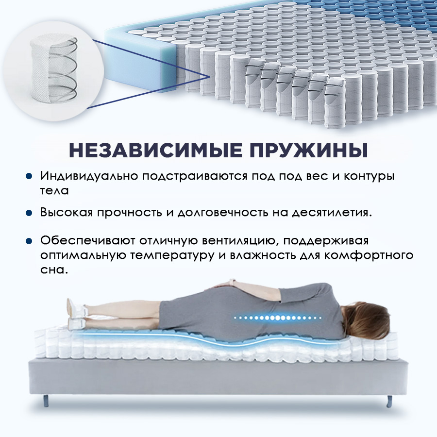 • ✓ Ортопедический эффект: Независимый пружинный блок гарантирует правильное положение позвоночника и отсутствие дискомфорта при движении.
