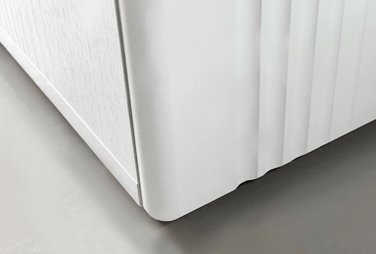• · Фасады из МДФ с матовым белым покрытием ПВХ украшены вертикальной фрезеровкой — это придает шкафу изысканную текстуру.